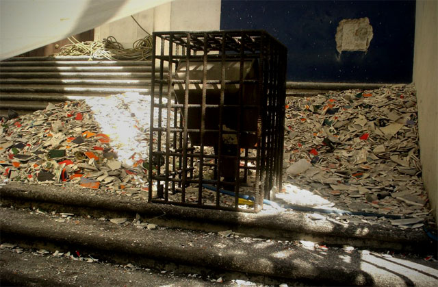 La catedral por fuera tampoco tiene mucha consonancia con su entorno y la realidad del país. En el costado derecho, el viernes por la tarde, cuando terminó la remoción de los azulejos –todavía no encuentro un verbo exacto para describir lo sucedido-, había una quinceañera en suntuoso vestido verde neón, con corset de pedrería bordada, listón que ataba el cuerpo y una falda de vuelos que parecía miles de bolsas plásticas verdes pegadas. Iba acompañada por sus damas de honor, el camarógrafo que registraba sus movimientos gráciles y sus familiares, la mayoría de mujeres enfundadas en tacones altos y vestidos pegados y llenos de lentejuelas, doradas y plateadas.Enfrente, en la Plaza Cívica, el ruido esquizoide de los vendedores ambulantes y las ventas de ropa de fin de año, los cohetes, la comida y las cachadas.